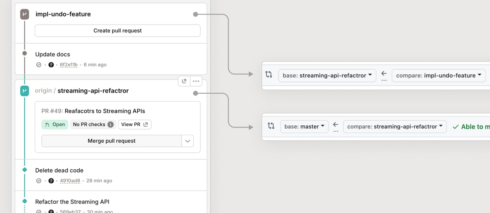 This of course does not mean that a Pull Request should be merged into its parent. When the bottom branch is merged on GitHub, if the PR branch is deleted, GitHub will automatically update any PRs that used to target it to target the default branch instead.