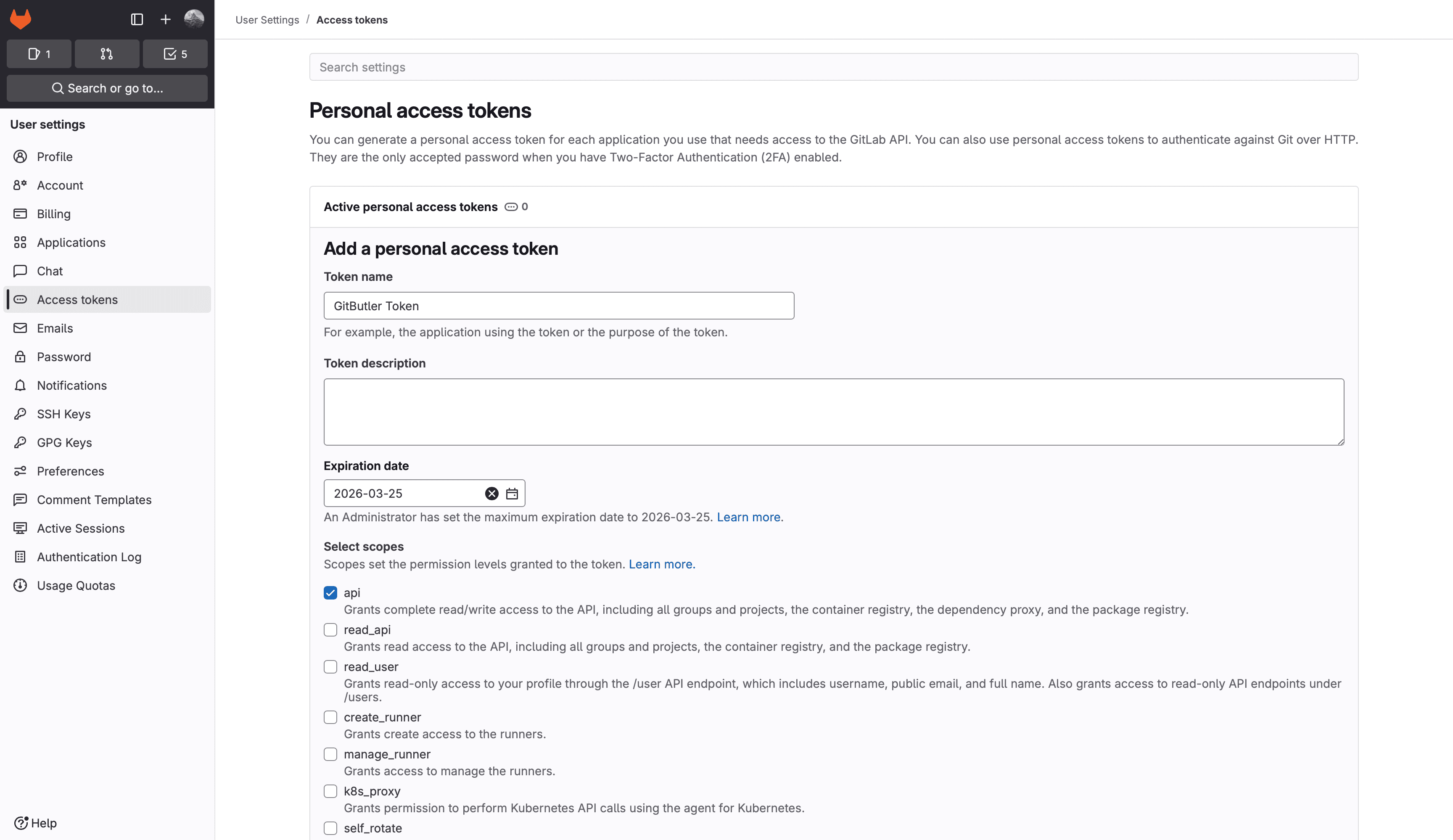 To create a GitLab Personal Token, navigate to your GitLab preferences, and then click on the "Access tokens" tab. You will then see an "Add new token" button. Pressing this button will provide you with a form (as captured below) where you can specify the token name, expiration date, and scopes. We currently require the api scope. In this example, I've chosen to set the expiration date for the token to a year from now.